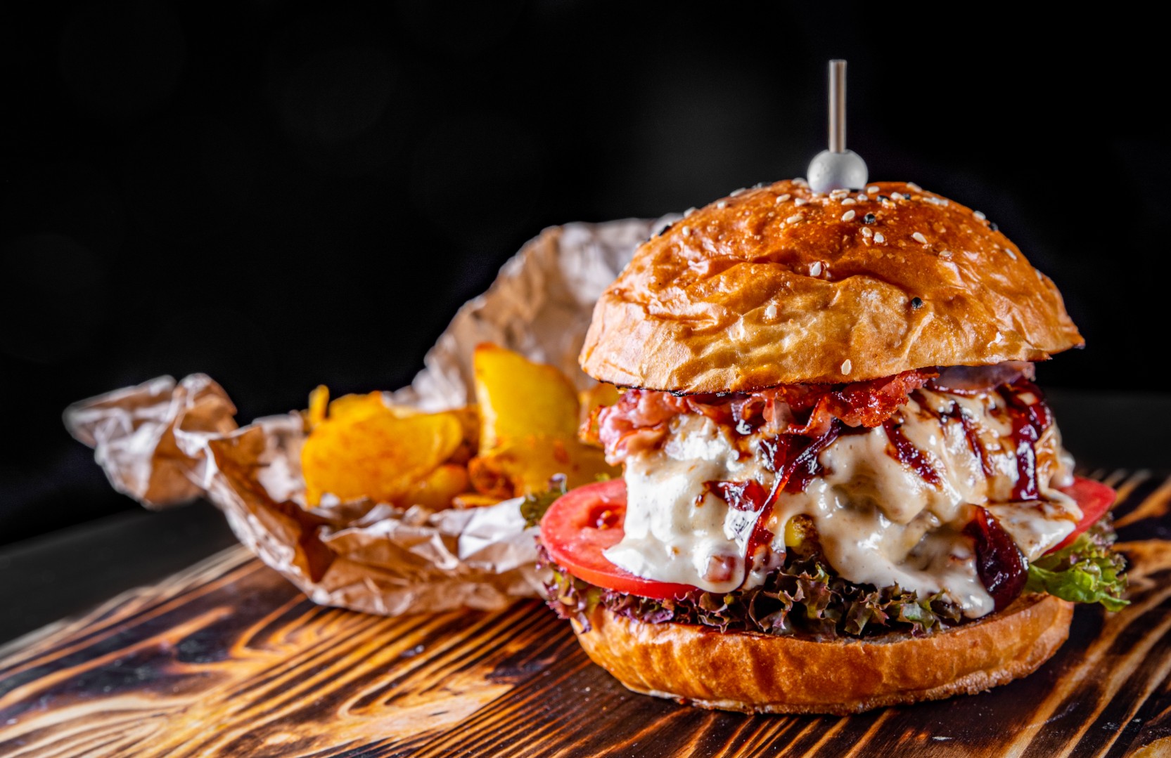 Мощный куриный бургер с луковым мармеладом, беконом, сыром чеддер. подается с картофелем “Айдахо”