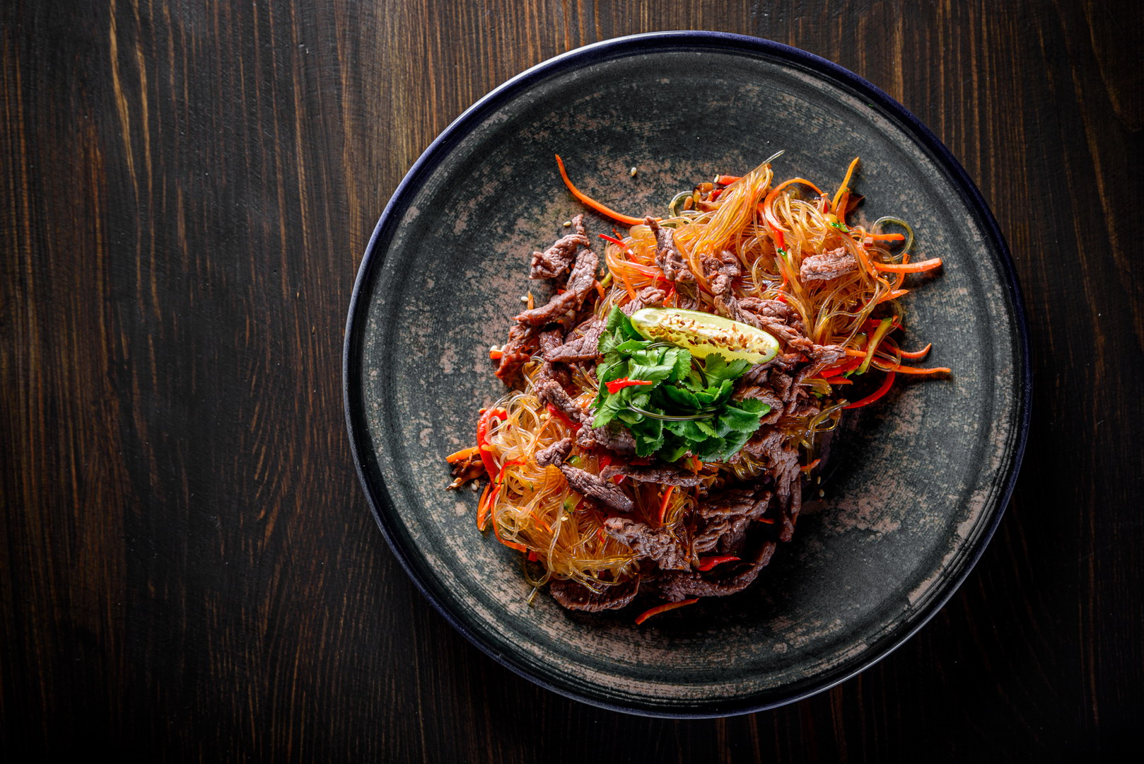 Состав: лапша стеклянная, говядина, болгарский перец, цукини, морковь, баклажан, азиатская заправка, кунжут, кинза, перец Чили, лайм