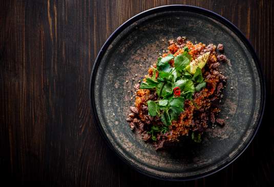Состав: рис тяхан, говядина, куриное яйцо, болгарский перец, цукини, морковь, баклажан, азиатская заправка, кунжут, кинза, перец Чили