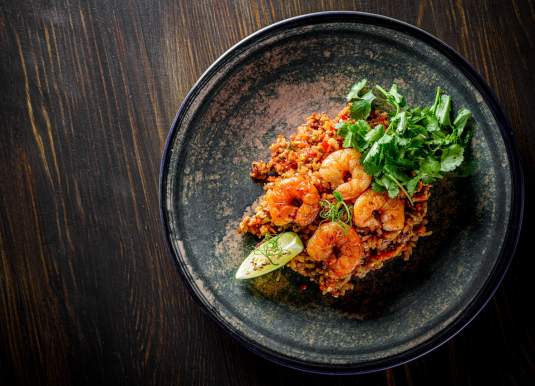 Состав: рис тяхан, креветки, куриное яйцо, болгарский перец, цукини, морковь, баклажан, азиатская заправка, кунжут, кинза, перец Чили