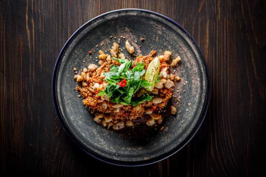 Классический тяхан похож на известный нам плов, но все же есть ряд отличий, которые уникализируют это блюдо. Состав: рис тяхан, курица, куриное яйцо, болгарский перец, цукини, морковь, баклажан, азиатская заправка, кунжут, кинза, перец Чили