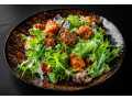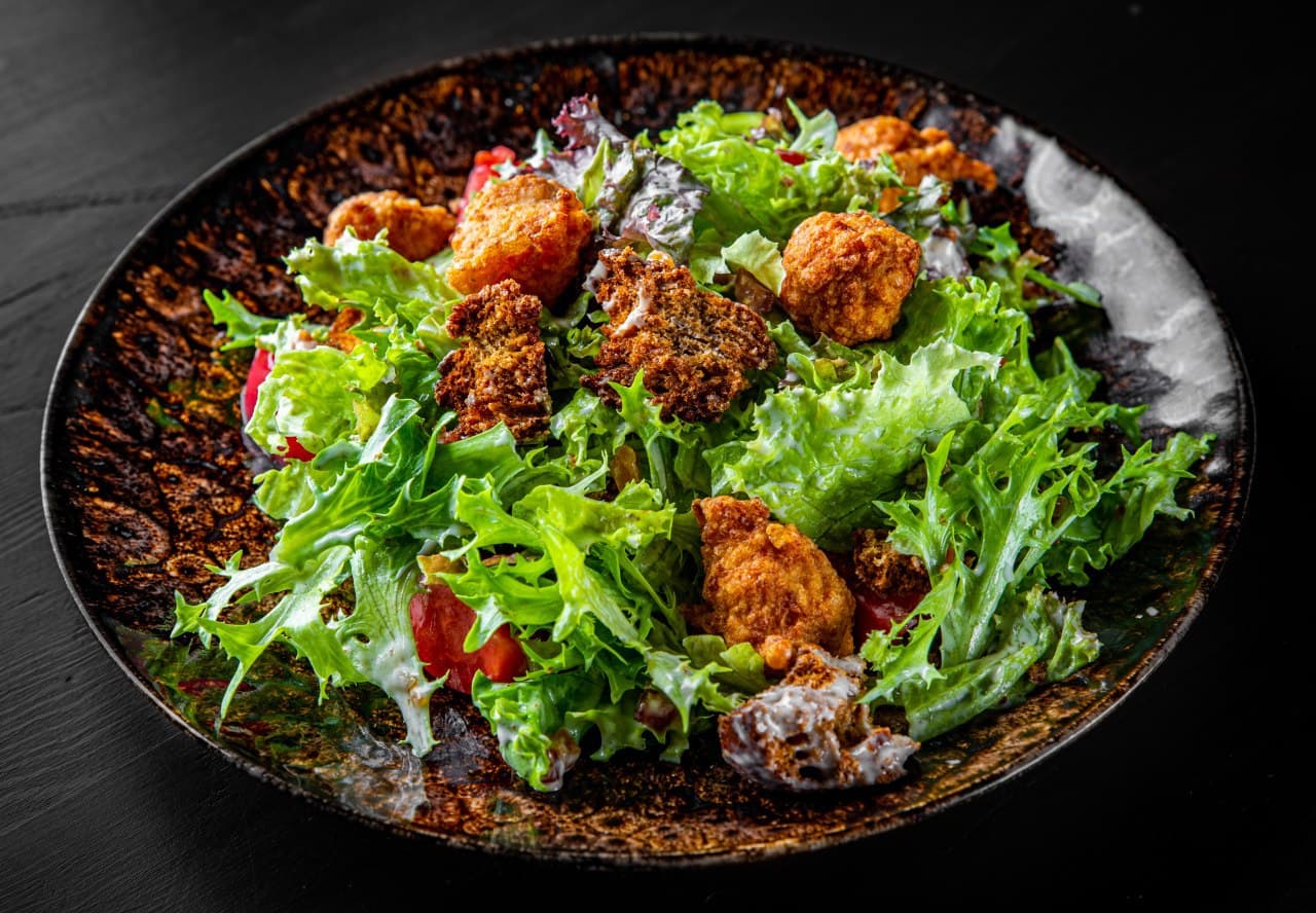 Не классический салат цезарь с джемом из бекона и пончиками из куриного филе