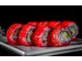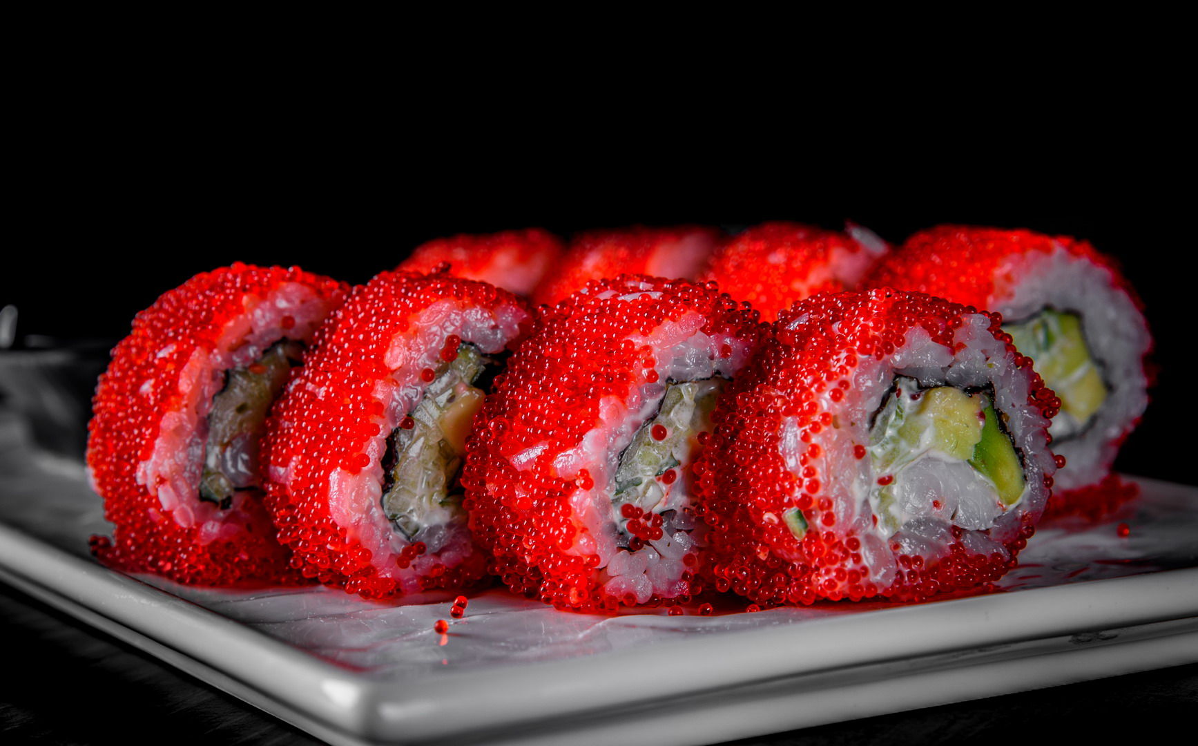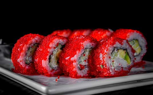 Состав: суши-рис, водоросли Нори, авокадо, огурец, сыр сливочный, креветки, майонез, икра летучей рыбы
