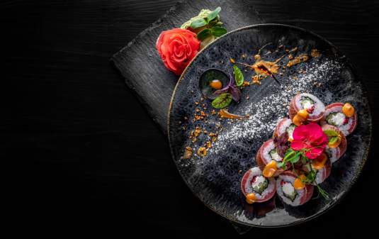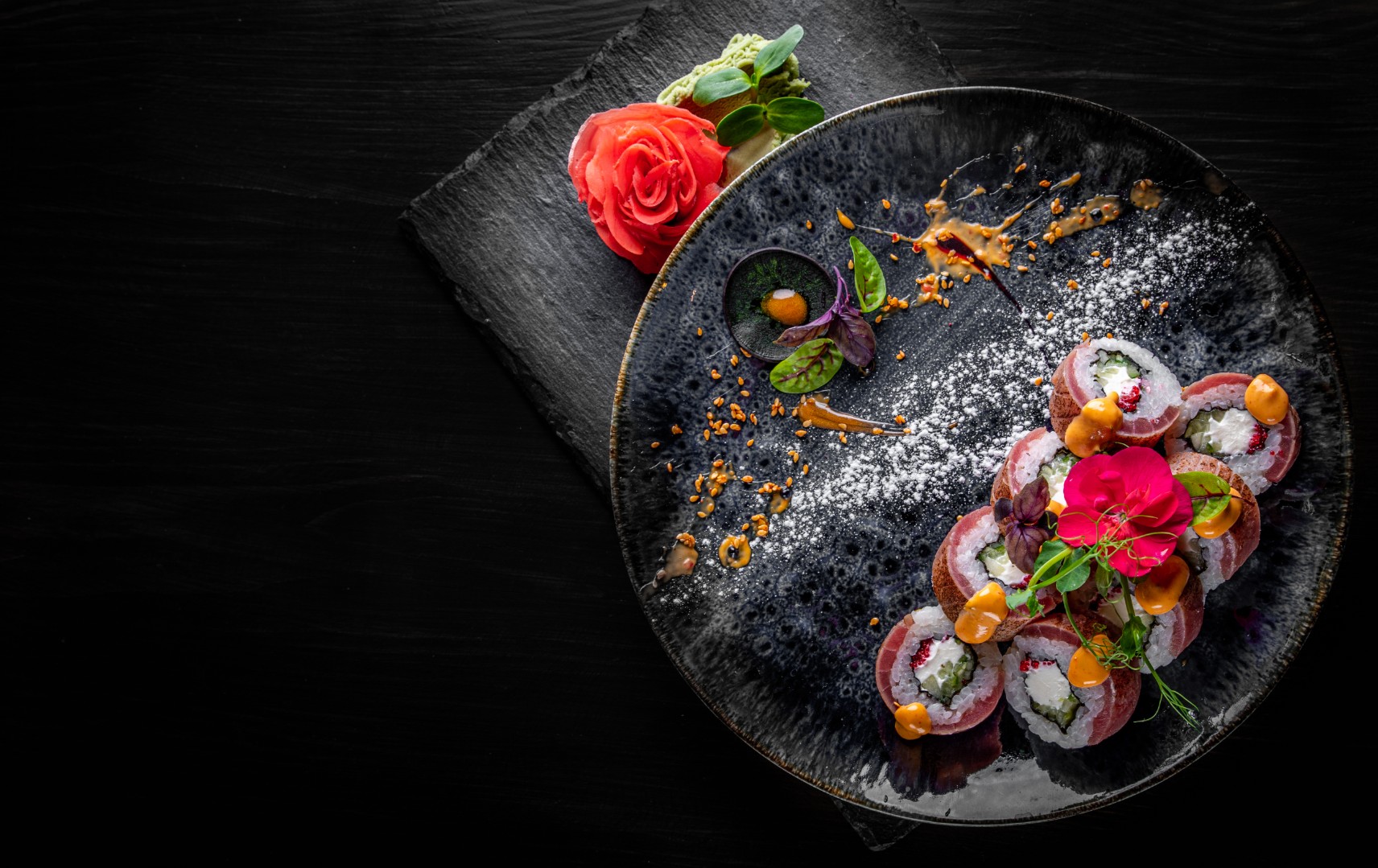 Тунец, сливочный сыр, тобико, соус спайси, огурец, нори, суши-рис