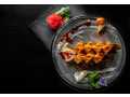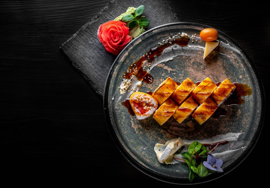 Мак ролл в рисовой бумаге с лососем терияки и чеддером (лосось терияки, лайм, сладкий перец, томат, яблоко, сыр Чеддер, соус унаги, рис, рисовая бумага