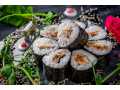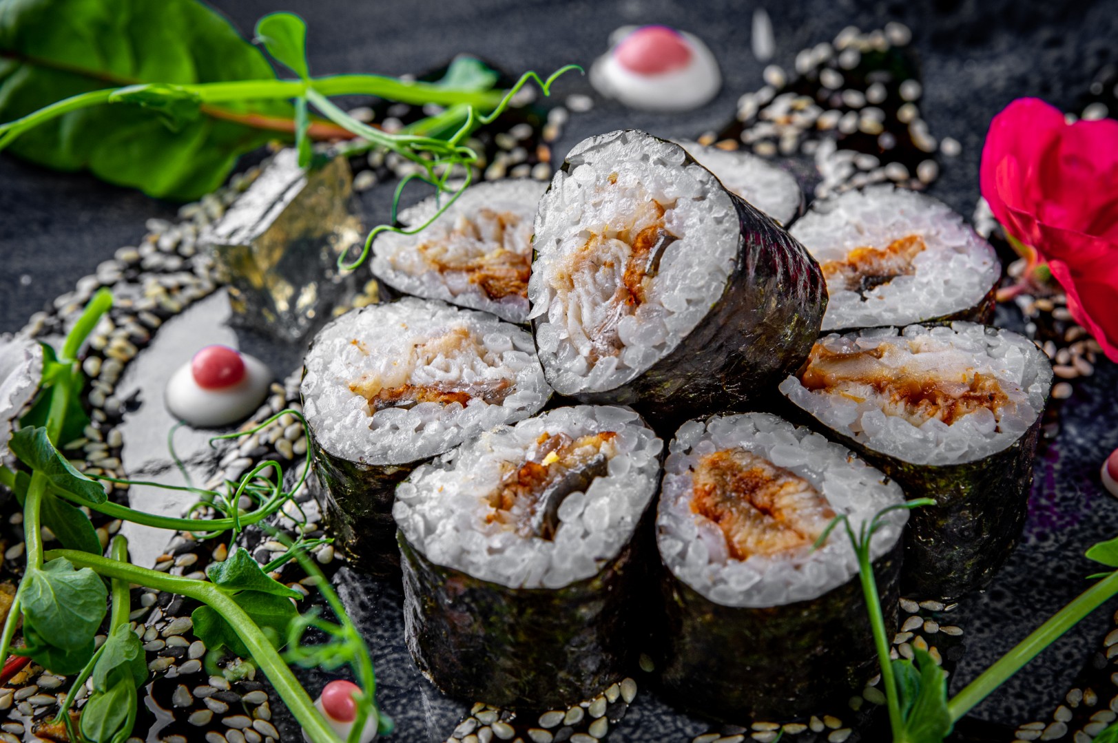 Угорь, соус унаги, кунжут, нори, суши-рис