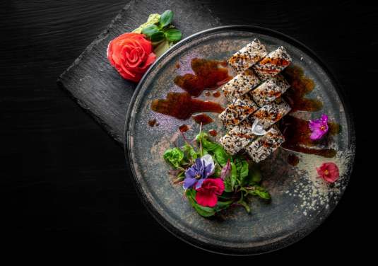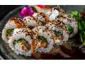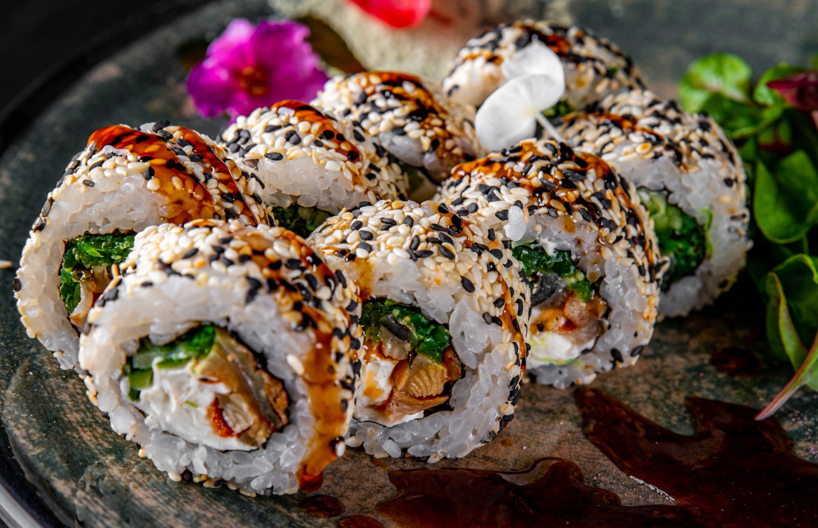Состав: суши-рис, водоросли Нори, угорь, огурец, сыр сливочный, соус Терияки, салат Чука, кунжут
