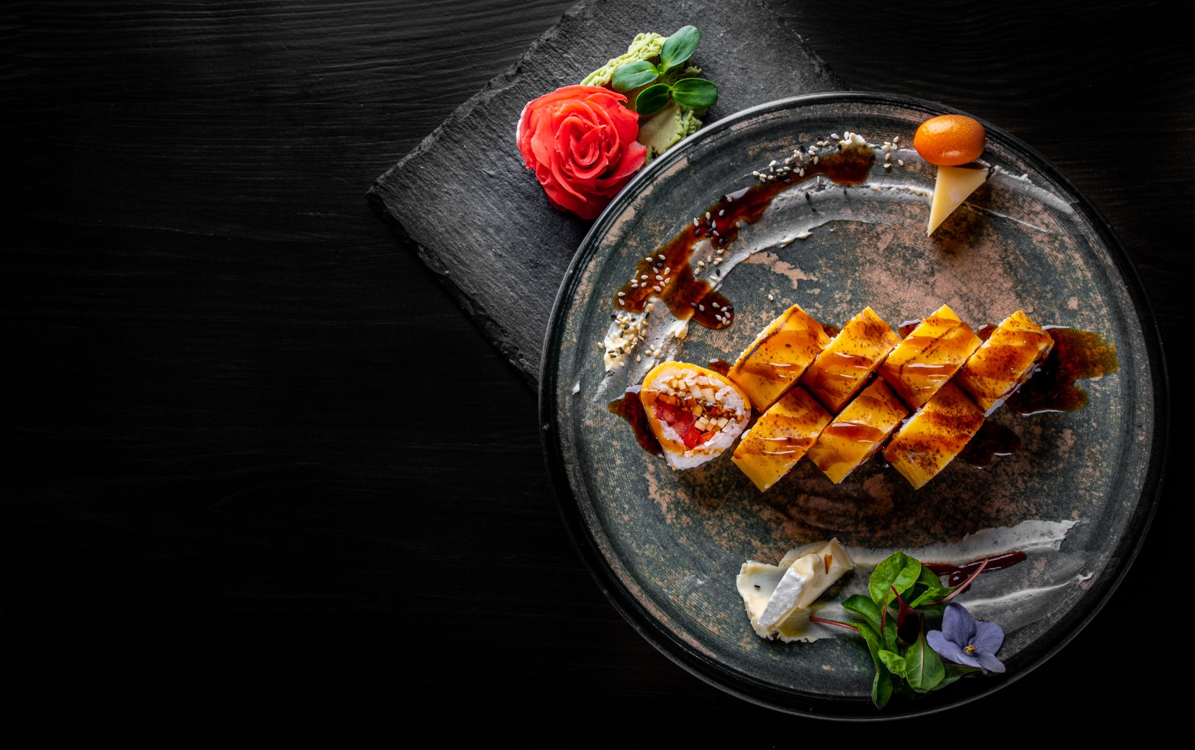 Состав: Лосось терияки, лайм, сладкий перец, томат, яблоко, сыр чеддер, соус терияки, суши-рис