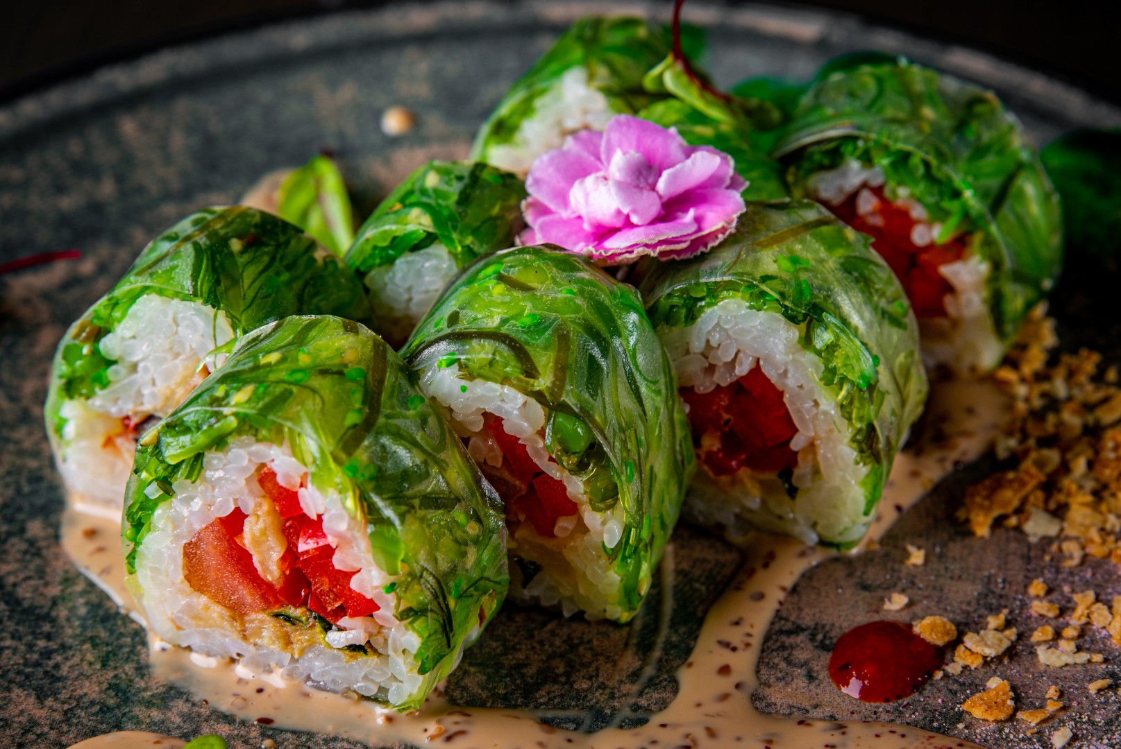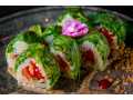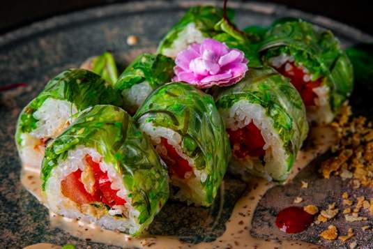 Состав: Баклажан, кабачок, томат, кунжут, лайм, салат чука, сладкий перец, кунжутный соус, рисовая бумага, суши-рис