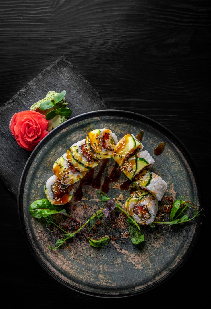 Кабачок, баклажан, томат, перец сладкий, салат айсберг, кунжут, соус унаги, нори, суши-рис