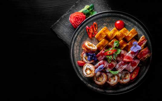 Ролл в рисовой бумаге с чедером и лососемРолл пряный в беконе с креветкой Ролл горячий с курицей и беконом