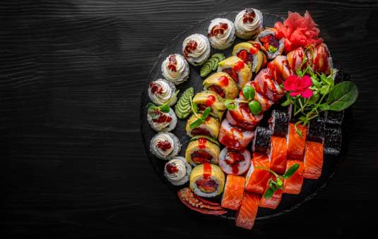 Ролл с лососем терияки и шапкой крем чизФиладельфия Ролл пряный в беконе с креветкой Ролл с тунцом в цукиниМак ролл с лососем и сыром