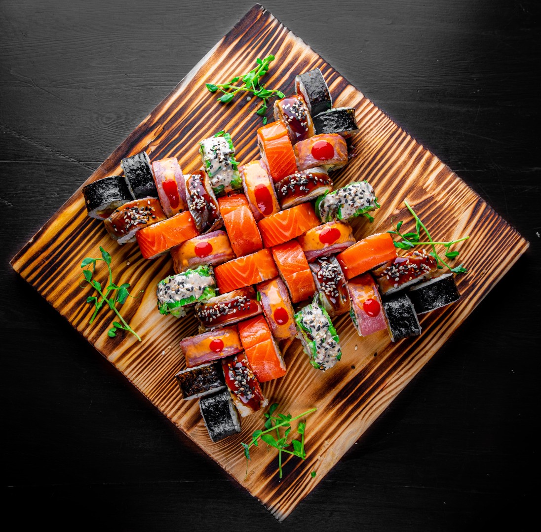 Сет состоит из: -Филадельфия-Пряный ролл в беконе с креветкой-Мак-ролл с запеченым лососем-Мини-ролл с тунцом