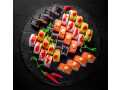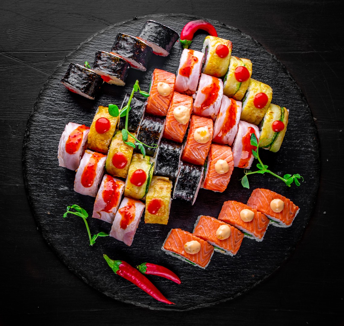 -Пряный ролл в беконе с креветкой-Ролл с тунцом в цукини-Мак ролл с лососем и сыром-Филадельфия татаки с арахисом