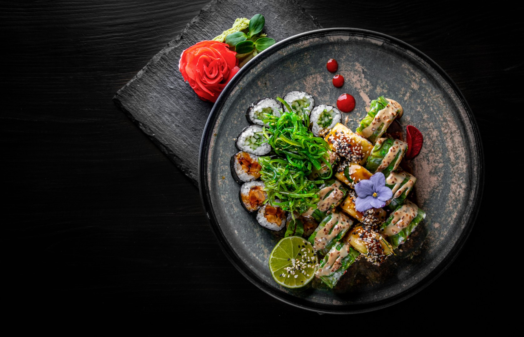 Мини ролл с грибами шиитаке 1/2Мини ролл с огурцом 1/2Ролл в рисовой бумаге с чука салатом и овощамиРолл вегетарианский с цукини 1/2Гунканы с чука салатом 2шт.